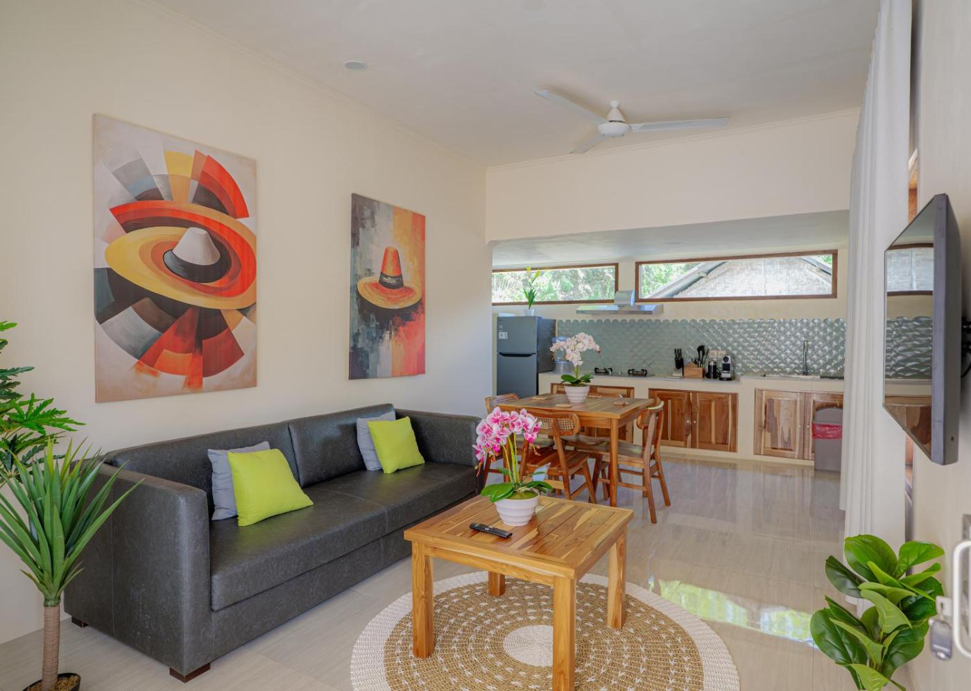 Two-Bedroom Villa. The hot tub is a top feature of this villa. Boasting a private entrance, this air-conditioned villa comes with 1 living room, 2 separate bedrooms and 2 bathrooms with a shower. The villas kitchen, which has a refrigerator and kitchenware, is available for cooking and storing food. Featuring a terrace with garden views, this villa also features a coffee machine and a flat-screen TV. The unit has 2 beds.